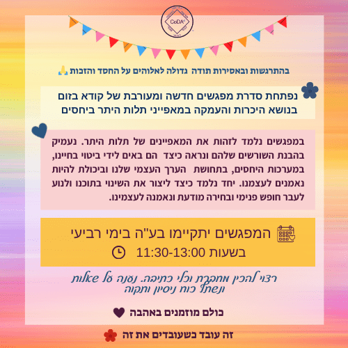 נפתחת סדרת מפגשים חדשה ומעורבת של קודא בזום בנושא היכרות והעמקה במאפייני תלות היתר ביחסים .