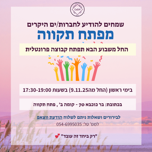 טראומטי ככל שייראה לך עברך ומייאש ההווה שלך, בתכנית 12 הצעדים של תלויי-יתר אנונימיים יש תקווה ליום חדש. לא תצטרך יותר לסמוך על אחרים כעל כוח גדול ממך. מי ייתן ותמצא כאן כוח פנימי חדש, זה שאלוהים ייעד לך – יקר ערך וחופשי.