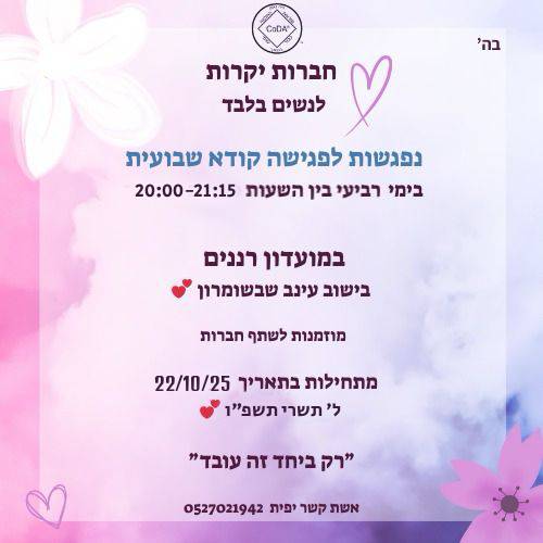 | ד' | ישוב עינב שבשומרון | 20:00-21:15 | במועדון רננים בישוב עינב שבשומרון מתחילות בתאריך 22/10/25 | יפית 0527021942 | פרונטלית לנשים |
